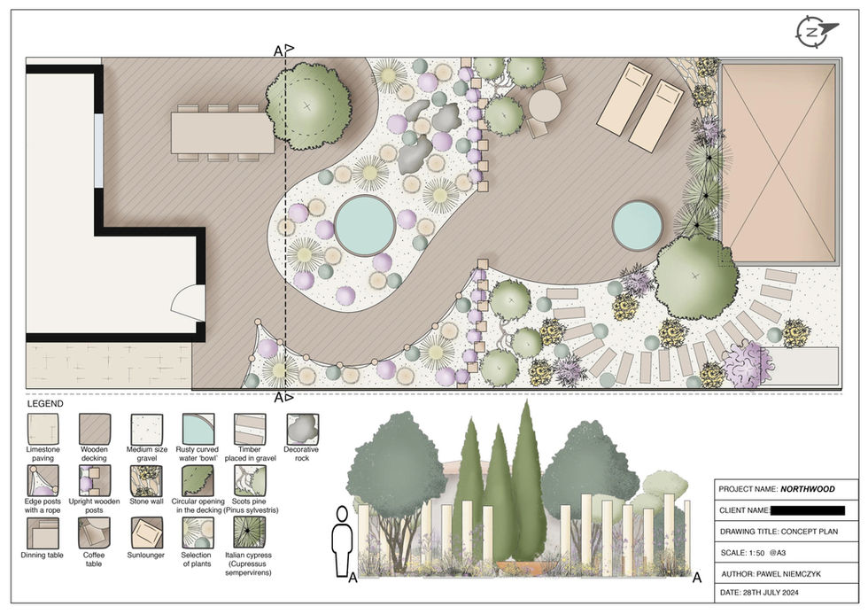 The client wished for a relaxing space inspired by Mediterranean garden style. In this project we suggested to divide the garden into two separate zones, each with a slightly different feel. Both of them linked together by durable solid oak decking and 2 similar shape, centrally located in each zones water features.